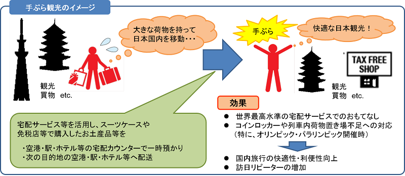 現状、外国人による訪日旅行は個人によるものが多数であり、その多くは自分で大きな荷物を持って日本国内を移動しています。自ら荷物を運ぶ必要がなければ、訪日外国人旅行者の利便性が向上し、観光立国の推進に資すると考えられるため、国土交通省では2020年東京オリンピック・パラリンピックを見据え、訪日外国人旅行者が日本の宅配運送サービスを利用し、手ぶらで観光できる環境を定着させるための検討を昨年度より物流及び旅行関係の団体・機関とともに進めております。 昨年度、訪日外国人旅行者に対するアンケート調査及びモニターツアーにより手ぶら観光のニーズ把握を行った結果、日本の宅配運送サービスは利用意向が高かったものの、認知度が低い、外国語対応が不十分等の課題が明らかとなったことから、標記協議会を開催し、日本の宅配運送サービスについて諸外国の方々に知っていただくこと等を目的とした具体的な取組みについて検討・実施することとします。
