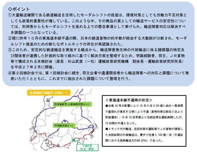 昨年10月6日から16日までの東海道本線不通の際、日本の鉄道貨物の約半数が経由する大動脈が分断され、特に積極的にモーダルシフトを進めていた貨物鉄道利用者において、代替輸送のためのトラック確保に苦労するなど、モーダルシフト推進のためのボトルネックの存在を再認識することとなった。