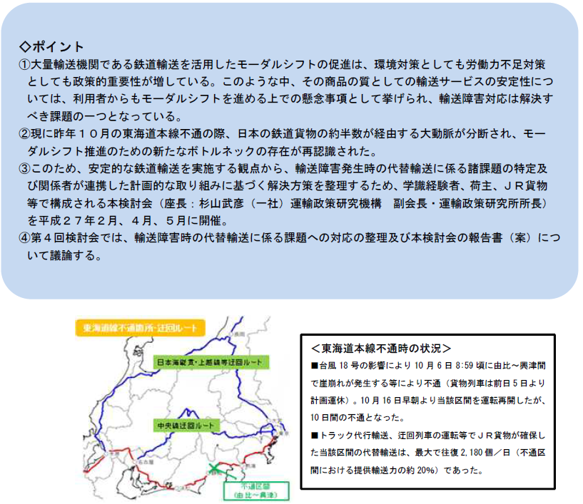 このため、東海道、山陽、東北線等の主要幹線が一定期間不通となる事態を念頭に、モーダルシフトの一層の促進のため、旅客会社の既存の鉄道施設、設備を前提として、代替輸送に係る諸課題の特定及び貨物鉄道会社、荷主、鉄道利用運送事業者等の関係者が連携した計画的な取り組みに基づく解決方策を整理するため、物流審議官の私的検討会として、鉄道局の協力も得つつ本検討会を開催するものである。