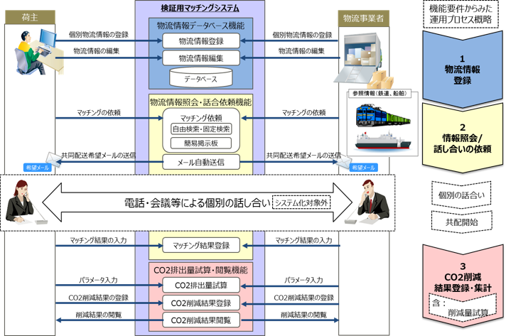検証用マッチングシステムは、様々な業種の企業が貨物やトラック等の情報を登録・照会することで、今まで出会うことができなかった企業が出会い、共同輸配送検討に繋げ、結果CO2削減を実現する事をその目的としています。出会いは荷主間、物流事業者間、荷主・物流事業者間のいずれも対象としています。