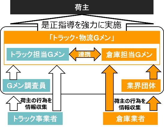 | 令和5年7月に発足した『トラックGメン』について、物流全体の適正化を図る観点から、「トラック・物流Gメン」に改組し、倉庫業者からの情報収集も行います。体制の拡充も図り、本省・地方運輸局等の物流担当部署から29名、各都道府県のトラック協会が新たに設ける「Gメン調査員」166名を追加して、総勢360名規模で、持続可能な物流の確保に向け着実に対処します。 |