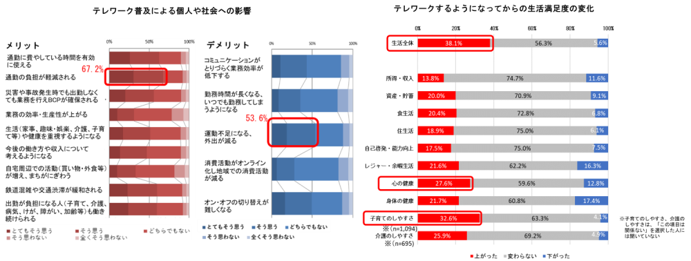また、テレワークをするようになってからの生活満足度の変化を東京都市圏(※3)居住者に質問したところ、約4割が生活全体の満足度が上がったと回答した。個別項目においては、「子育てのしやすさ」や「心の健康」への満足度が上がった割合が約3割と高かった。