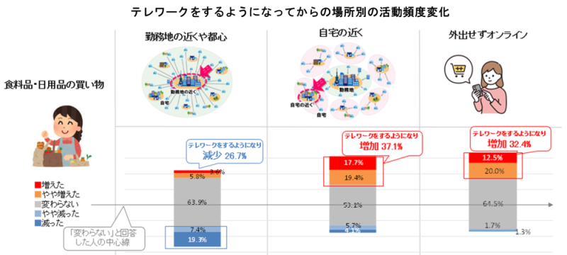 現在もテレワークを継続している人(※4)は、テレワークをするようになってから、食料品・日用品の買い物について、勤務地の近くでの買い物頻度が減少傾向であり、自宅の近くやオンラインでの頻度が増加していることがわかった。