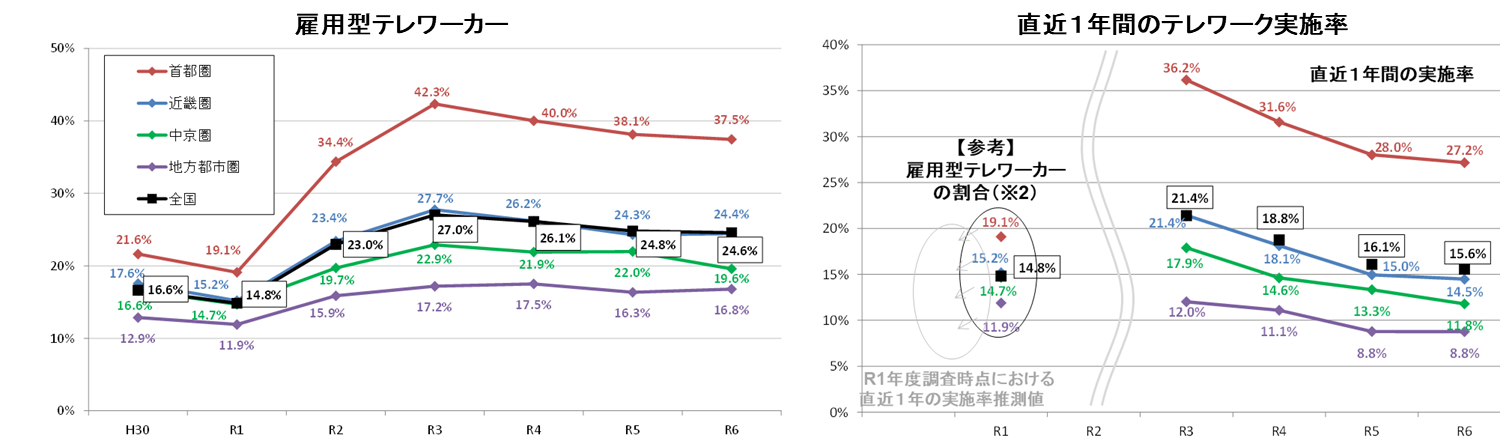 コロナ禍以降の直近1年間のテレワーク実施率(※2)は、地方都市圏を除いた圏域において減少傾向であったが、全国平均ではコロナ流行前より高水準であると推測される。
