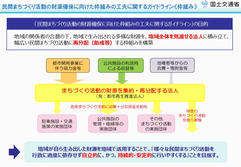 ※ 本ガイドラインは、「まち・ひと・しごと創生基本方針2018」(平成30年6月15日閣議決定)で定められた「団体間の連携による地域の財源を活用する仕組みの構築」、並びに、「まちづくり活動の担い手のあり方検討会とりまとめ」(平成29年10月26日国土交通省都市局)において今後の施策の方向性として示された「活動財源を地域の協議会等で積み立てる仕組みの検討」について具体化を図るものです。