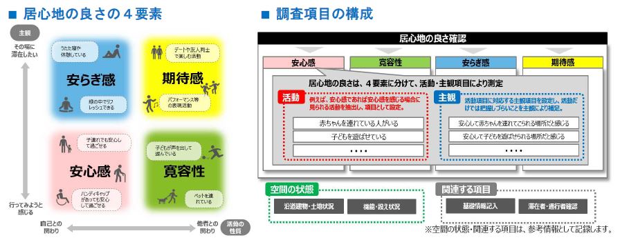 これまでは、ハードの整備状況や滞在者・通行者数等によりまちなかの状態を把握していました。本指標は、これらに加え、滞在者・通行者がどのように場を利用しているか【活動】、どのように感じるか【主観】に着目し、それらを「居心地の良さの4要素」に分類して計測することで、都市空間の質を可視化します。