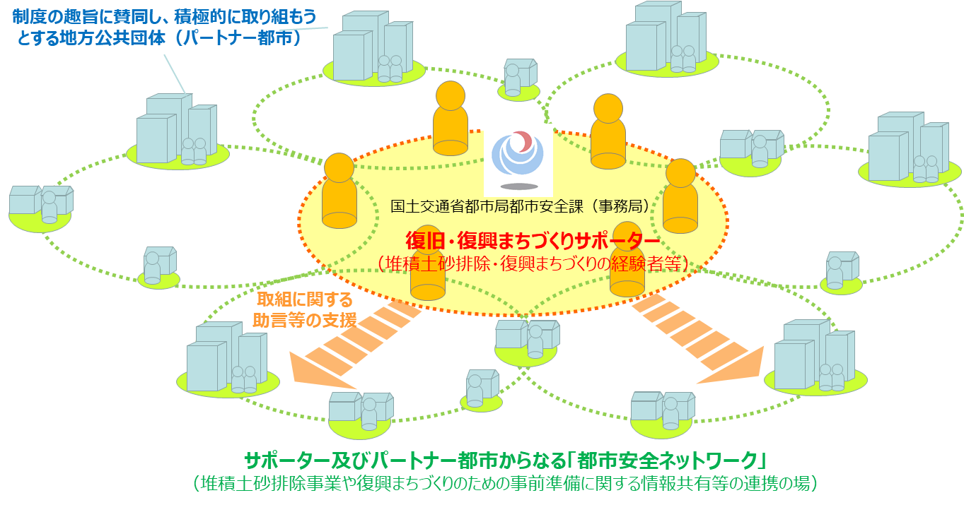 | 国土交通省では、「まちなかに堆積した土砂の排除」及び「復興まちづくりのための事前準備」についてノウハウを伝授できる地方公共団体の職員・ OB を「復旧・復興まちづくりサポーター」として登録し、地方公共団体を支援する「復旧・復興まちづくりサポーター制度」を創設します。 あわせて、 本制度を活用して自らの対応力を高めたい、 相 互の情報交換等を通じて全国的に取り組みを波及する一助となり たいと考える地方公共団体を「パートナー都市」として 全国から募集し 、「都市安全ネットワーク」として整備します。 |