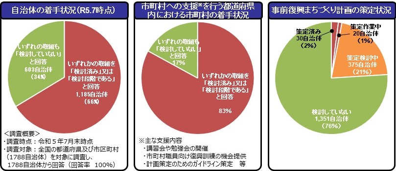 ・ 昨年度に引き続き、ガイドラインに基づく復興事前準備の取組状況について、全国の都道府県及び市区町村を対象に実施した調査結果をとりまとめました。