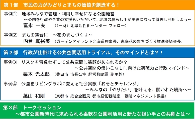 | 国土交通省では、令和4年2月~9月にかけて「都市公園の柔軟な管理運営のあり方に関する検討会」を開催し、より柔軟に都市公園を使いこなすための質の高い管理運営のあり方等について議論・検討を行い、同年10月に提言を公表しました。 このたび、国、地方公共団体、市民、民間事業者をはじめ、多様な主体が協力して本提言の趣旨を踏まえた取組を加速させていくために、都市公園の柔軟な管理運営をテーマとするオンラインセミナーを開催いたします。 |