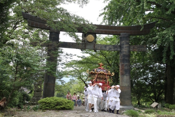 【添田町】英彦山神宮参道沿いにある重要文化財・英彦山神社銅鳥居での神幸祭