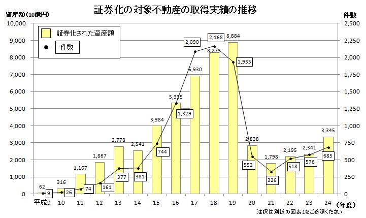 平成24年度中に不動産証券化の対象として取得された不動産またはその信託受益権の資産額は、3兆3,450億円(前年度比プラス42.9%)、3年連続の増加となりました。これは、Jリートの取得額が前年度比約2倍の1.6兆円と大幅に増加したことが大きく影響しています。