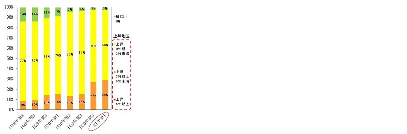 | 主要都市の高度利用地等(全国100地区)における平成31年1月1日~平成31年4月1日の地価動向を調査した地価LOOKレポート によれば、主要都市の地価は全体として緩やかな上昇基調が継続(上昇地区数は引き続き97地区)。 ◆上昇地区数の割合が5期連続して9割を上回る。但し、緩やかな上昇(0~3%の上昇)の地区が68地区。 ◆住宅系2地区(宮の森(札幌市)、天王寺(大阪市))で上昇幅が拡大し、比較的高い上昇(3~6%の上昇)となった。 |