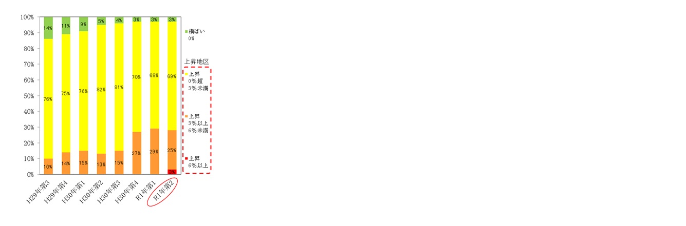 | 主要都市の高度利用地等(全国100地区)における平成31年4月1日~令和元年7月1日の地価動向を調査した地価LOOKレポート によれば、主要都市の地価は全体として緩やかな上昇基調が継続(上昇地区数は引き続き97地区)。 ◆上昇地区数の割合が6期連続して9割を上回る。緩やかな上昇(0~3%の上昇)の地区が69地区で最多。 ◆大阪市の商業系3地区(西梅田、茶屋町、新大阪)で上昇幅が拡大し、6%以上の上昇となった。 |