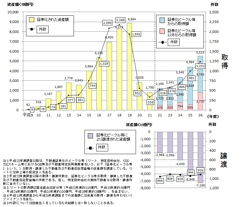 平成26年度中に不動産証券化の対象として取得された(証券化ビークル等が取得した)不動産又はその信託受益権の資産額は約5.5兆円、件数は1,232件 となった。このうち、証券化ビークル等から取得されたものは約3.7兆円であった。また、証券化ビークル等が譲渡した資産額は約7.3兆円であった。