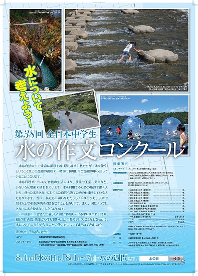 平成26年7月に施行された水循環基本法第10条において、国民の間に広く健全な水循環の重要性についての理解と関心を深めるようにするため、「水の日」が8月1日と定められました。水の日の趣旨にふさわしい事業の一環として、次代を担う中学生を対象に、水について理解を深め、考える機会とする第38回「全日本中学生水の作文コンクール」を次のとおり実施します。