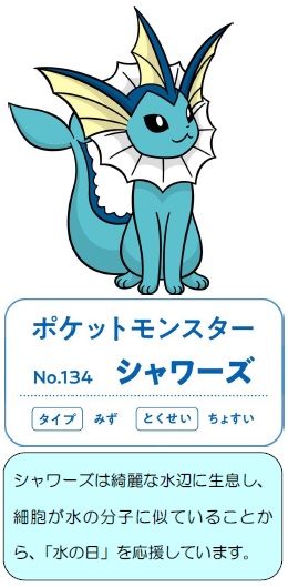 | ポケットモンスター(通称ポケモン)は、若者を中心に幅広い世代に人気があり、世界中に多くのファンを持つ作品です。 水循環に関する世論調査(令和2年度)により、「水の日」の認知度は、18 歳~29 歳で3.8%(全体で10.9%)と、特に若い世代で低いことがわかりました。 そこで、[タイプ:みず、とくせい:ちょすい]という「水の日」のPRにふさわしく、ゲームソフト『ポケットモンスター赤・緑』から登場するシャワーズを「水の日」応援大使に任命し、様々な活動を通じて、「水の日」の認知度向上を図ります。 |