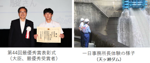 最優秀賞及び優秀賞の受賞者は、8月上旬に東京都で行う「水の日」記念行事「水を考えるつどい」の表彰式において、賞状等の授与を予定しています。また、副賞として、ダムを管理する事務所等において、管内巡視など「一日事務所長」を体験していただく予定です。