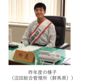 一日所長体験は、最優秀賞及び優秀賞受賞者のうち希望者を対象に、在住地域の地方整備局又は水資源機構の現地事務所において、河川やダムの管理業務等を体験いただくことによって、河川及びダム等が治水や利水に果たす役割や水の大切さに対する理解を深めていただくことをねらいとしています。