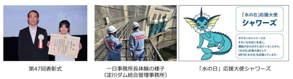 最優秀賞及び優秀賞の受賞者は、7月下旬に東京都で行う「水の日」記念行事「水を考えるつどい」の表彰式において、賞状等の授与を予定しています。また、副賞として、ダムを管理する事務所等において、管内巡視など「一日事務所長」を体験していただく予定です。