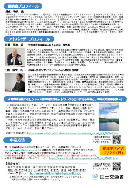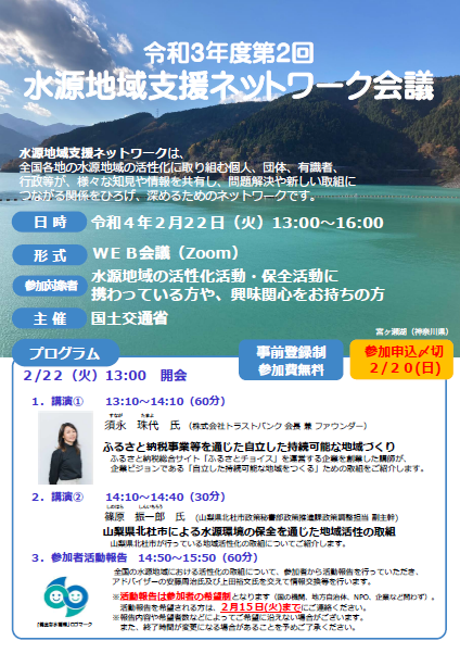 | 水源地域の活性化に向けて、ふるさと納税総合サイト「ふるさとチョイス」を 運営する企業を創業した須永珠代氏を講師に迎え、講演等をオンラインで行います。 お申し込みいただければどなたでもご参加いただけます。 |