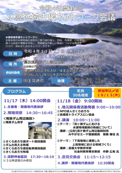 | 水源地域間の連携を深め、水源地域の活性化活動の発展を図ることを目的として、島根県尾原ダム周辺地域において、現地視察を行うとともに、地元関係者から地域に対する思い、将来展望などを聞き、地域資源の新たな活用方法や、地域内外の連携の在り方について検討します。 |