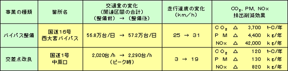 西大宮バイパスを整備した結果、周辺道路を含めた20リンクにおいて、交通量は1%増加したものの、PM、NOx、CO