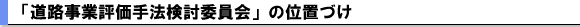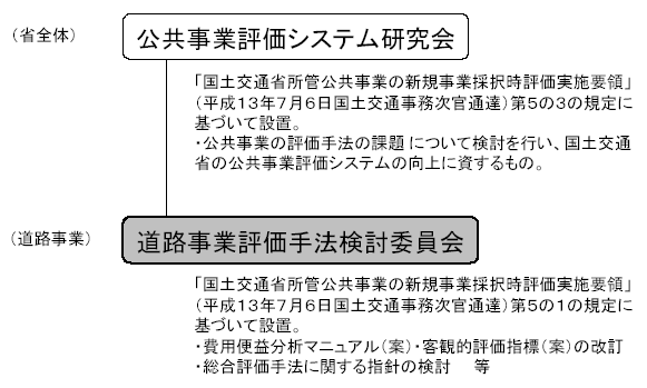 「国土交通省所管公共事業の新規事業採択時評価実施要領」(H13.7.6 事務次官通達)第5-1 において「所管部局等は、事業種別ごとの評価手法の策定・改善に当たっては、学識経験者等から構成される委員会を設置し、意見を聴く」ことと規定。「道路事業評価手法検討委員会(仮称)」は、これに基づく委員会として位置づけ。