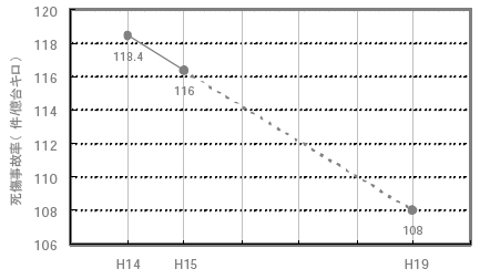 現在、死傷事故は、1億台キロ当たり(1万台の自動車が1万キロ走行した場合に相当)平均118.4件発生している。これを平成19年度までに約1割削減し、1億台キロあたり約108件とすることを中期的な目標としている。