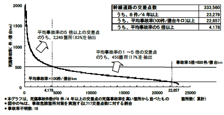 幹線道路における対策を効率的かつ効果的に実施するため、特に事故の危険性が高い箇所を事故危険箇所として指定し、公安委員会と連携して交差点改良等の事故抑止対策を集中的に実施する。事故危険箇所は、死傷事故率が幹線道路平均の5倍以上の箇所、事故が多発しており10年に1度以上の確率で死亡事故が発生するおそれの高い箇所等を平成15年7月に3,956箇所抽出した。(事故多発地点数)