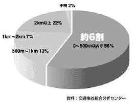 市町村道以下の生活道路における死傷事故率は1億走行台キロあたり191件と、全道路の平均値のおよそ2倍であり、特に歩行者・自転車の事故については、幹線道路の3倍以上となっている。また、歩行中・自転車乗用中の交通事故死者のうち、約6割の方が自宅から500m以内で亡くなっており、歩行が中心となる自宅周辺の生活道路における安全性が確保できていないことがわかる。(図10-10)