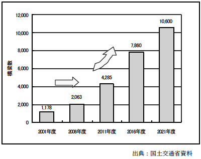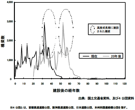 これらの橋梁は、20年後には新設後50年を経過することになり、その橋梁数は現在の約10倍にもなる。(図11-3、図11-4)
