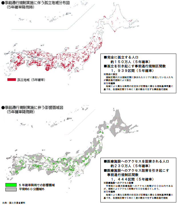 こうした通行規制の影響により、例えば、5年に1回よりも高い確率で生じる豪雨に伴う事前通行規制により、完全に孤立する人口は約150万人、高次医療施設への1時間以内のアクセスが阻害される人口は約230万人に達すると試算される。(図12-3)