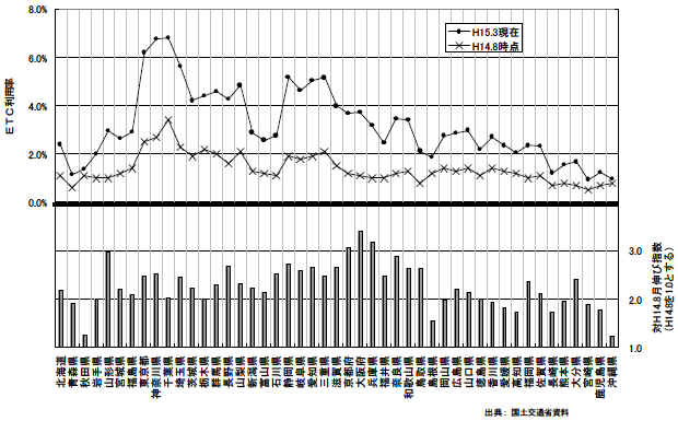 | ※ | ETC利用率及び利用台数は日本道路公団、首都高速道路公団及び阪神高速道路公団の調査結果に基づく。 |