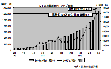 全国のETC車載器のセットアップ台数は累計約129万台(平成15年7月21日現在)、ETC利用率にして約8%(平成15年7月現在)となっている。普及台数が導入から累計100万台に達するまでの期間は、カーナビゲーションで4年間、VICS(道路交通情報通信システム)で3年間を要したのに対し、ETCは2年3ヶ月で到達したことからも、ETCの普及は着実に進んでいることがわかる。(図2-2、図2-3、表2-1)