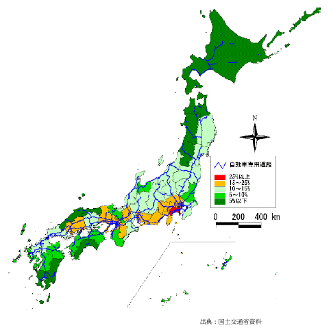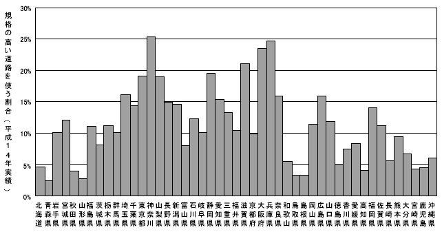 日本の「規格の高い道路を使う割合」は約13%と欧米諸国の約20〜30%に比べて著しく低く(図4-2)、さらには都道府県別では約3〜25%と地域間格差が大きいなど、道路(自動車専用道路・幹線道路・生活道路)の機能分化が進んでいないことがわかる。(図4-3、図4-4)