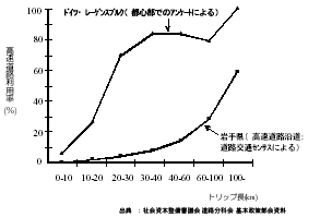 地域において20〜30%を占める長距離トリップが、事故率が低く走行速度の高い自動車専用道路によって分担されることで、幹線道路・生活道路など本来の役割に見合った機能分化の適正化が図られる。道路の本来の役割に見合った機能分化の適正化の度合いを表す中間アウトカム指標として「規格の高い道路を使う割合」を採用したものである。