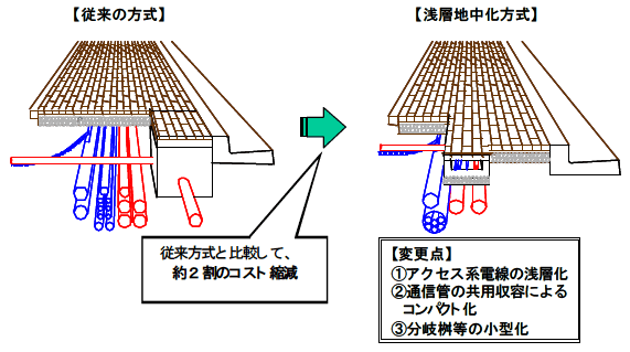 | (2)浅層埋設方式の導入 | 従来よりコンパクトで簡便な浅層埋設方式を標準化 掘削埋め戻し土量の削減等により概ね2割のコスト縮減を目標 |