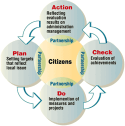 This framework involves the following aspects: Numerical targets are set beforehand (Plan), Measures and projects are implemented (Do), Achievement levels are evaluated (Check) and Results are reflected on administration management in next year (Action).
