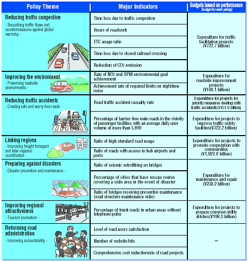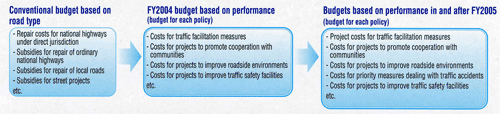 In FY2004, budget allocation based on road type (such as national highway", "local road", etc.) was shifted to allocation based on the performance of each policy (e.g., traffic facilitation and cooperation with the community ).