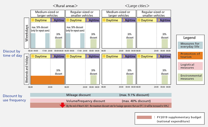 While promoting the adoption of ETC2.0 for haulage operators that carry out logistics functions in both normal and disaster times, in order to reduce logistics costs and strengthen management structures to improve productivity, extend the increase in the maximum rate of volume and frequency discounts from 40% to 50% through the end of March 2021.