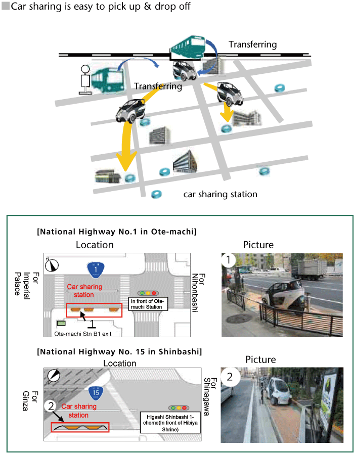 -The pilot program (on national highway No.1 in Ote-machi and No.15 in Shinbashi) has demonstrated a degree of need for on-road car sharing.