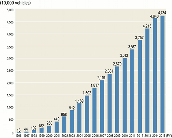 Since it went into service in March 2001, ETC users have been rapidly increasing in number with the quick popularization of ETC on-board units. At the end of March 2011, there were about 34.24 million ETC-equipped vehicles. ETC users now account for 86.2% of all vehicles on expressways in Japan.