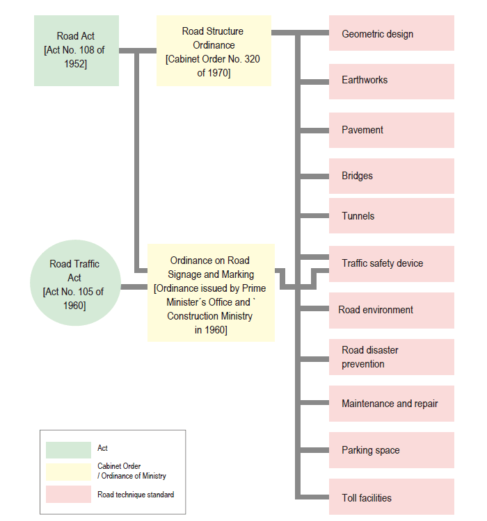 This Ordinance specifies general technical standards (limited to the provisions of the Road Act (hereinafter referred to as the "Act") Article 30.1.1, 30.1.3 and 30.1.12 for general technical standards of the structure of prefectural roads and municipal roads) for the structure of national expressways and national highways when these roads will be newly constructed or reconstructed and also specifies general technical standards that should be taken into account when technical standards (except for the provisions in Article 30.1.1, 30.1.3 and 30.1.12) for the construction of prefectural roads and municipal roads are required under the ordinances of prefectural or municipal governments, who also serve as a road administrator.