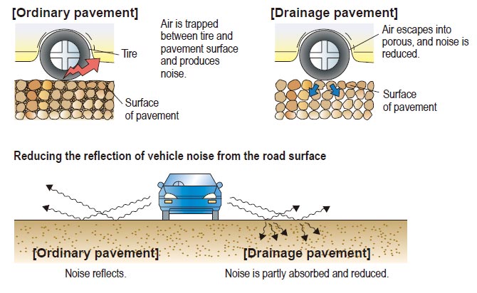 The surface is more porous than ordinary pavement, allowing water to seep down through it. The water passes through the pavement and flows along an inclined impermeable course, and is then discharged to side gutters. The pavement drains well, remains non-slippery on the surface even on rainy days, controls spray, and ensures good visibility.