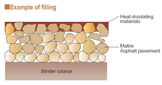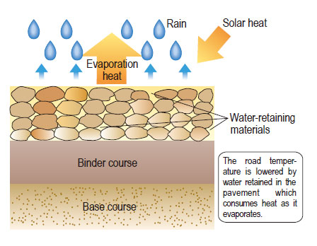 Water is retained in the pavement and the road temperature is lowered by the heat of water evaporation. Diverse technologies have been proposed, such as injecting water-retaining materials like polymers into the voids of asphalt mixtures, from which rain water and underground water slowly evaporate.