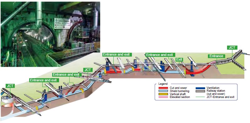 The Central Circular Shinjuku Route of the Metropolitan Expressway connects Shibuya, Shinjuku and Ikebukuro, which are major sub-centers of Tokyo. Two tunnels account for most of its 11 km length, one for the inbound lanes and the other for the outbound lanes.