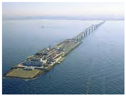 Of the 15.1 km of the Tokyo Bay Aqua-line Expressway across Tokyo Bay, which was completed in 1997, about 10 km is a tunnel under the ocean and the remaining 5 km is a bridge (Aqua Bridge). A ventilation tower ("Kaze-no-to") was constructed in the middle of the tunnel, and a manmade island ("Umihotaru") was constructed where the tunnel and the bridge meet.