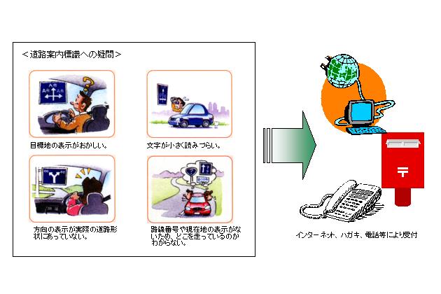 | 道路案内標識に対する道路利用者の意見については、標識BOXや各管理者の窓口において受付けています。 これらの意見は、道路案内標識を整備・管理する上で、非常に重要なものとなっています。 |