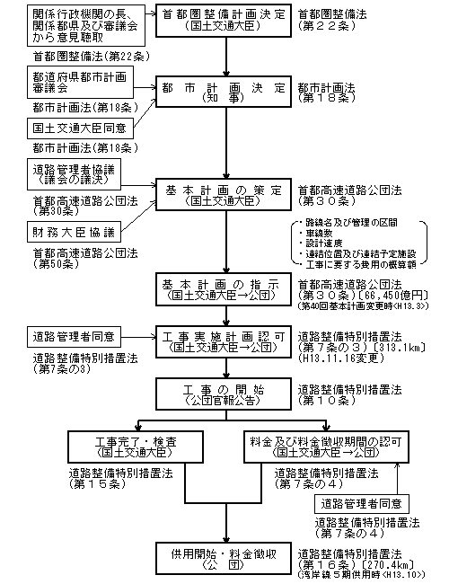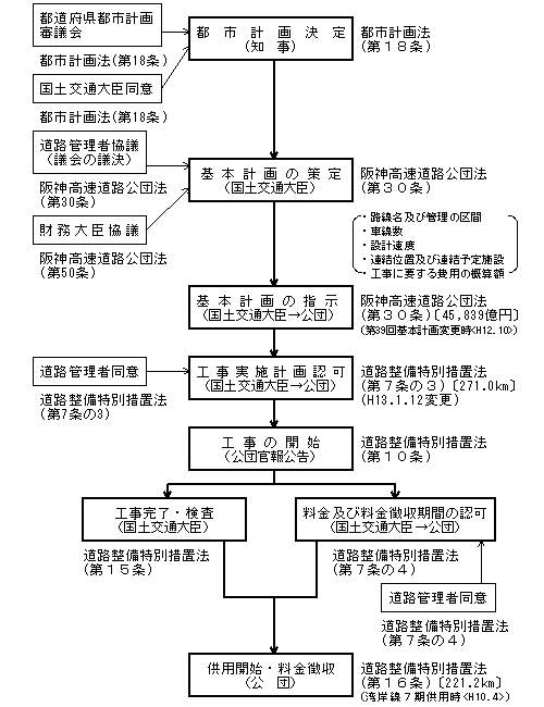 国土交通大臣の基本計画指示を受けて各公団が事業を実施(指定都市高速道路は国土交通大臣の整備計画の許可を受けて各公社が事業を実施)