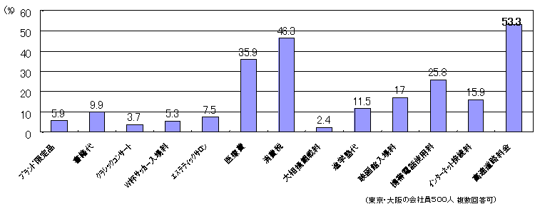<参考>高速道路料金に関する世論調査・アンケート調査 ○「高速道路の通行料金についてどう考えるか」(H13.1 内閣府 「道路に関する世論調査」より) ○「現在、高くて許せないもの」 (H13.11 (株)クラレ アンケート調査 「現代会社員のプライス感覚」より)